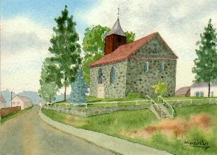 Ein nachweislich 1724 existierendes evangelisches Bethaus, Filiale von Märkisch Friedland, war als solches im Jahre 1789 nicht mehr vorhanden[9]. Die jetzt noch am Ort existierende Kirche ist ein um das Jahr 1840[10] errichteter Feldsteinbau. Im Jahre 1887 besaß sie zwei Glocken. Von den beiden Glocken ist die grössere glatt und ohne Inschrift, die kleinere enthält den Namen des Pfarrers und Kirchenvorstehers sowie die Worte: "Durch Gottes Hülf goss mich Lorenz Kökeritz anno 1632"[11] Das Aquarell links zeigt den Blick auf die Kirche in Alt Lobitz von http://www.hiazintus.com/hiazintus.htm |