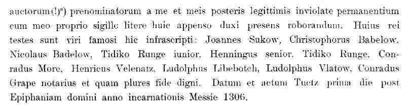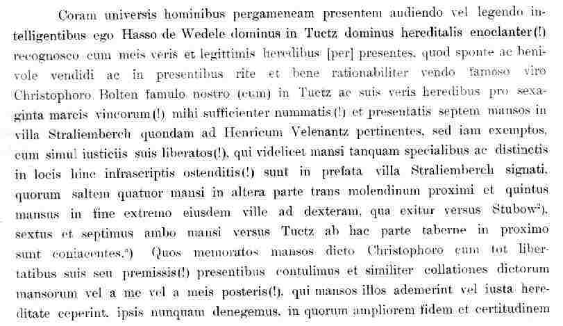 Einer der ältesten Urkunden im Croner Land ist die Kaufurkunde über die sog. Bolt´schen Hufen im Dorf Strahlenberg. Diese Urkunde ist deshalb von großem geschichtlichen Wert, weil in ihr auch die damaligen Vasallen der Tützer Herrschaft als Zeugen mit aufgeführt sind. Genannt werden: Sukow, Babelow, Zadelow, Tidike Runge jun., Henning, Winanz, Libebotch, Wlatow und Grape. Verkauft werden 7 Hufen im Dorf Strahlenberg. Der Kaufpreis, 60 Mark Finkenaugen, wird in bar entrichtet. Vorher gehörte das Land dem Edelmann Hennikus Winanz, der jedoch die Besitzung mit all seinen Rechten wieder an die Wedels zurück gegeben hatte. Diese sog. Bolt´schen Hufen wurden auch genau bezeichnet: 4 Hufen liegen hinter Mühle, eine Hufe befindet sich rechts am Ende des Dorfes auf dem Weg nach Stibow, die beiden letzen Hufen liegen diesseits des Kruges in Richtung Tütz. Quelle unter der lfd. 849 in: |