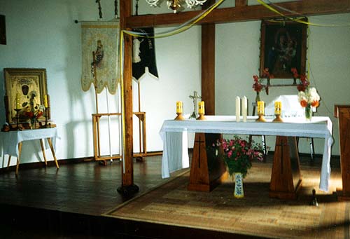 Die Kirche Die turmlose Kirche wurde an einer Nebenstraße auf einer kleinen Anhöhe errichtet. Man erreicht die Kirche über zwei Treppen. Die Kirche ist ein Holzgebäude und mit Schindeln eingedeckt. Die Kirche hat keinen Turm sondern einen einfachen hölzernen Glockenstuhl einige Meter neben dem Kirchenschiff. Zum Kirchengebäude gehört eine kleine Sakristei. Ein kleiner Friedhof befindet sich etwas weiter entfernt von der Kirche auf einer Anhöhe am südlichen Rand des Dorfes. Heute überwuchert kaum zu durchdringendes Buschwerk den Friedhof, vereinzelt sind noch Grabeinfassungen und auch noch ein Grabstein zu finden. Die Inschrift lässt sich nicht mehr eindeutig entziffern. Es könnte es sich um das Grab eines um 1850 verstorbenen Mielke handeln. . |