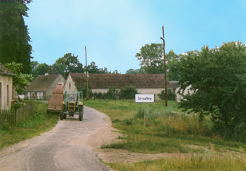An der Wegekreuzung am Ortsausgang von Strahlenberg Richtung Neustrahlenberg und Stibbe finden wir ein Marienbild. Das Foto rechts zeigt die Dorfstrasse in Richtung Stibbe im Jahre 1998. Strahlenberg ist heute polnisch und heißt Straliny.